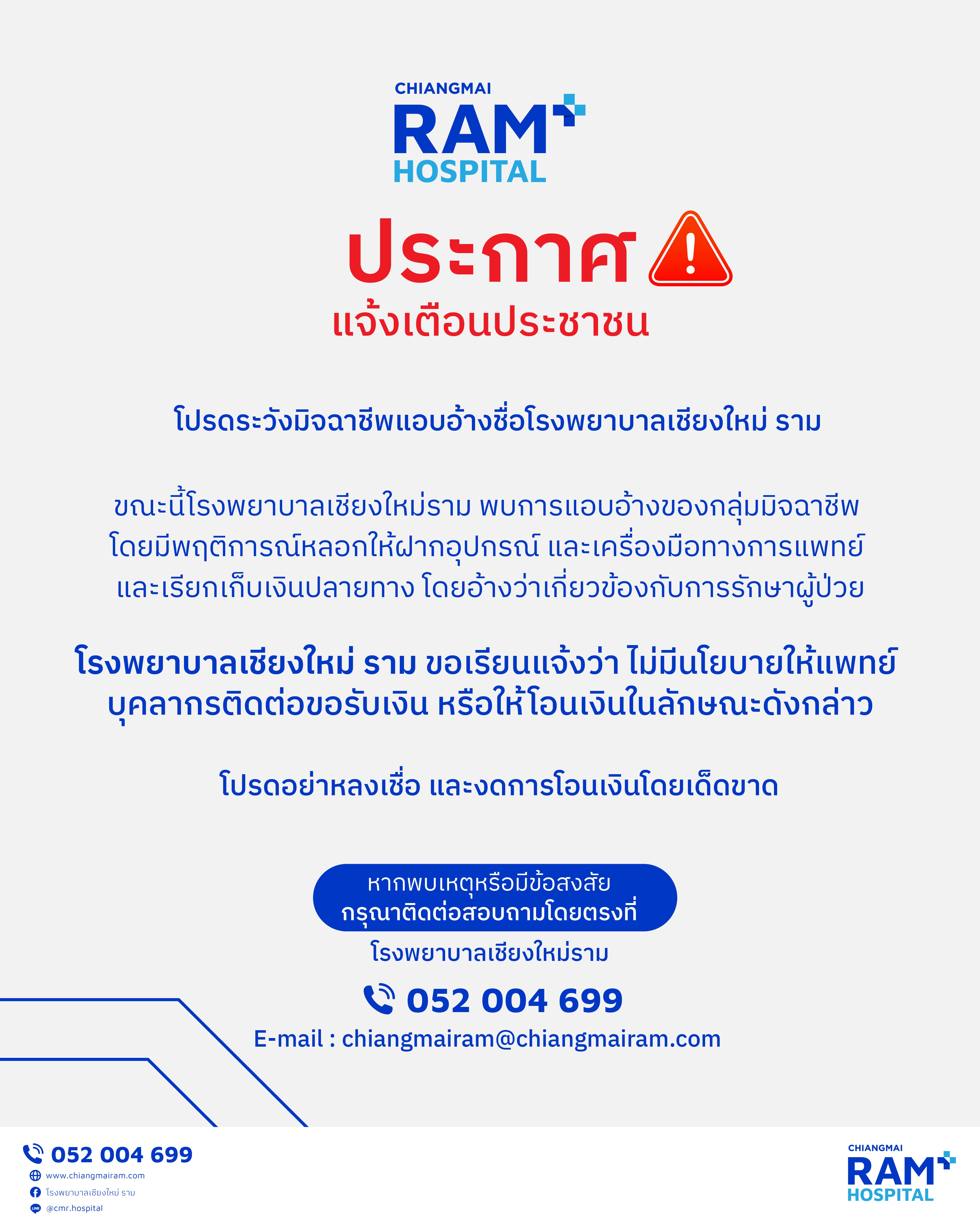 โรงพยาบาลเชียงใหม่ ราม ขอเรียนแจ้งว่า ไม่มีนโยบายให้แพทย์ บุคลากรติดต่อขอรับเงิน หรือให้โอนเงินในลักษณะดังกล่าว