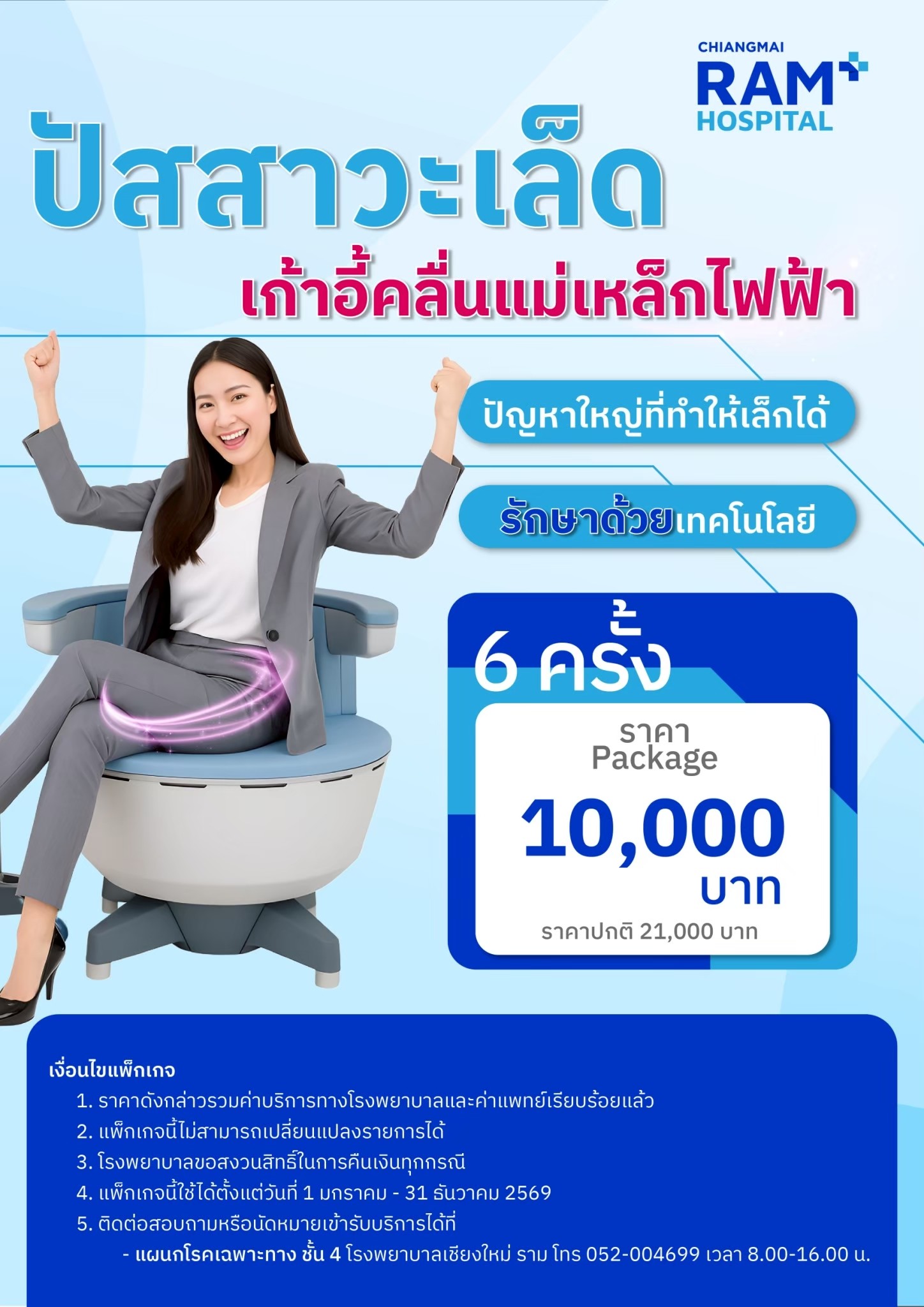 เทคโนโลยีเก้าอี้คลื่นแม่เหล็กกระตุ้นระบบประสาทและกล้ามเนื้ออุ้งเชิงกราน ช่วยรักษาอาการกลั้นปัสสาวะไม่อยู่ จากภาวะกล้ามเนื้ออุ้งเชิงกรานอ่อนแรง มดลูกหย่อน สามารถฟื้นฟูและควบคุมการทำงานของระบบประสาทกล้ามเนื้อบริเวณอุ้งเชิงกรานให้หดตัว เสมือนการบริหารกล้ามเนื้ออุ้งเชิงกรานด้วยการขมิบหรือที่เรียกว่า Kegel Exercise