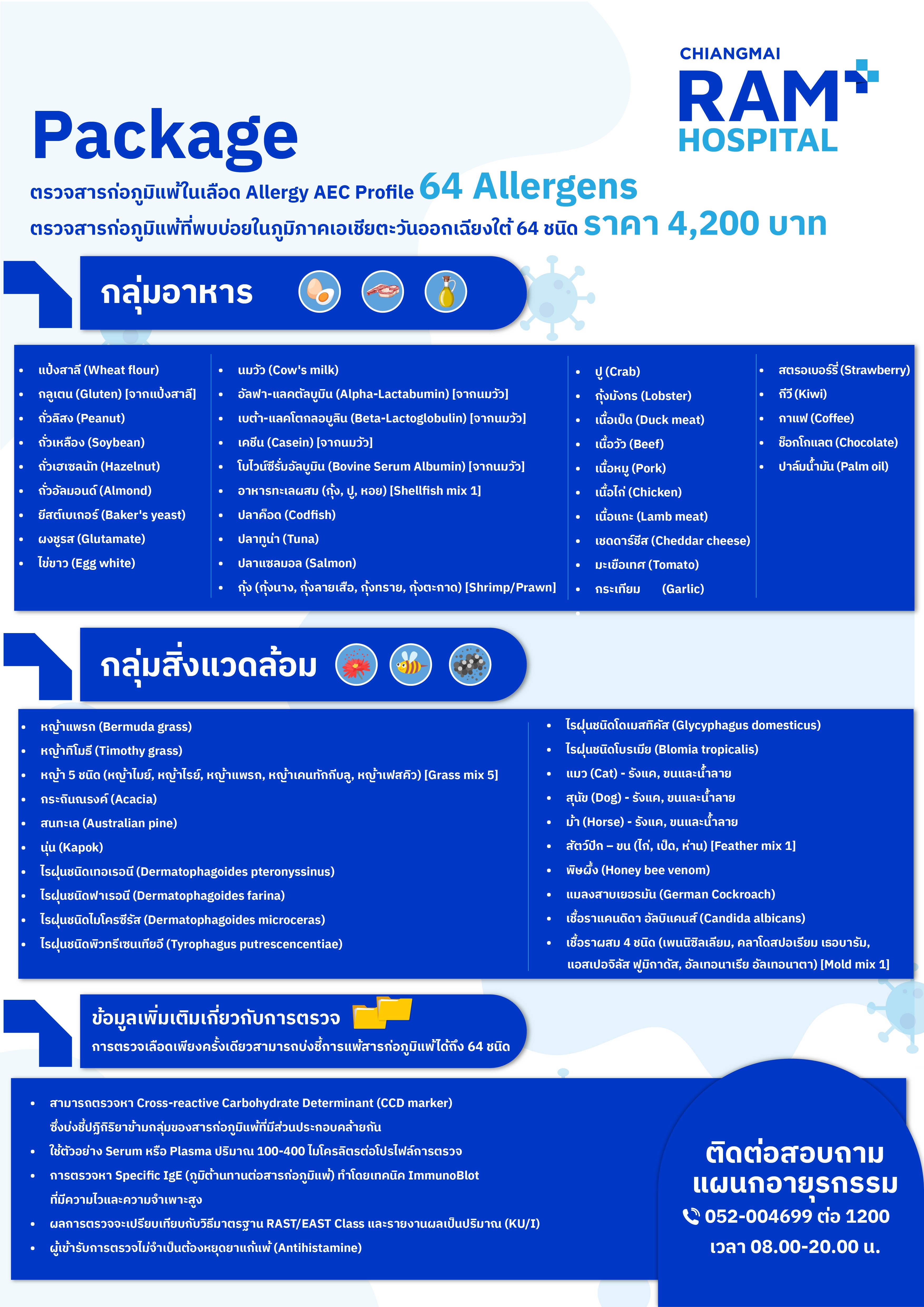 รายละเอียดแพ็กเกจตรวจสารก่อภูมิแพ้ในเลือดที่พบบ่อยในเอเชียตะวันออกเฉียงใต้ 64 ชนิด และในไทย 36 ชนิด ราคาเริ่มต้น 2,800 บาท