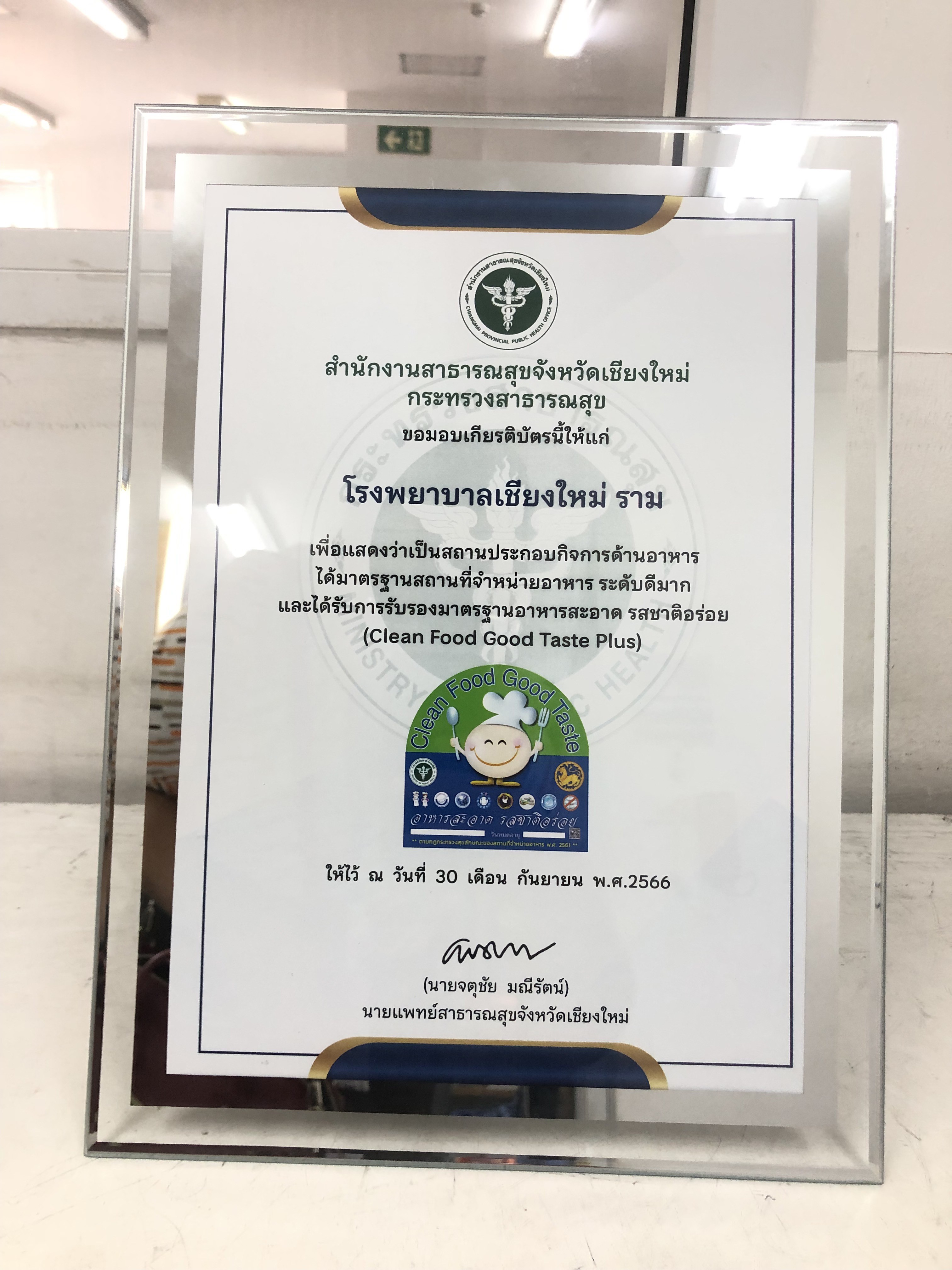 เมื่อวันที่ 26 ก.ย. 66 นพ.ธวัชชัย ตัณสถิตย์ กรรมการบริหาร และคุณศิรินทิพย์ กันทะวงค์ หัวหน้าแผนกโภชนาการ โรงพยาบาลเชียงใหม่ ราม ร่วมพิธีรับมอบ ป้ายสัญญาลักษณ์ (Clean Food Good Taste Plus)
