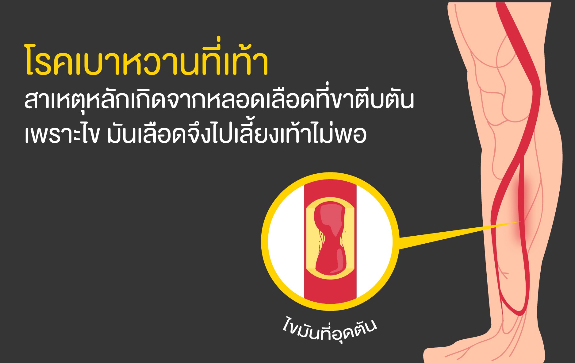 โรคเบาหวานทำให้หลอดเลือดตีบและแข็ง ส่งผลให้เลือดไปเลี้ยงที่เท้าได้น้อยลง ทำให้แผลหายช้า แผลติดเชื้อได้ง่ายและมีโอกาสเกิดบาดแผลใหม่ได้ง่าย